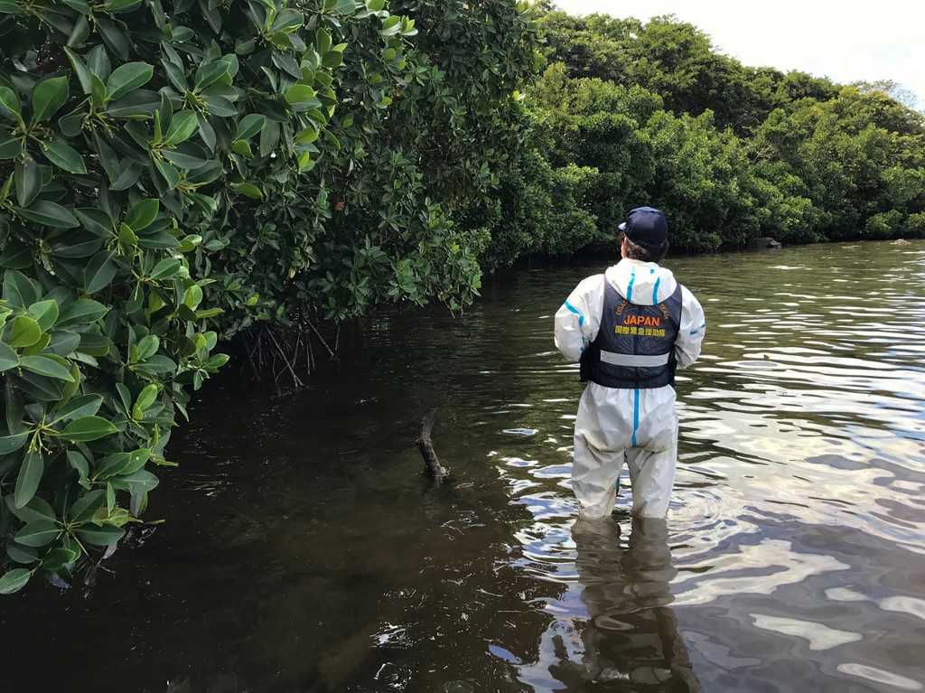 This handout picture taken on August 22, 2020 and received from the Japan International Cooperation Agency (JICA) on August 25 shows a JICA expert confirming oil drifting in swamps where mangroves live in Mauritius. (Photo by Handout / Japan International Cooperation Agency / AFP)