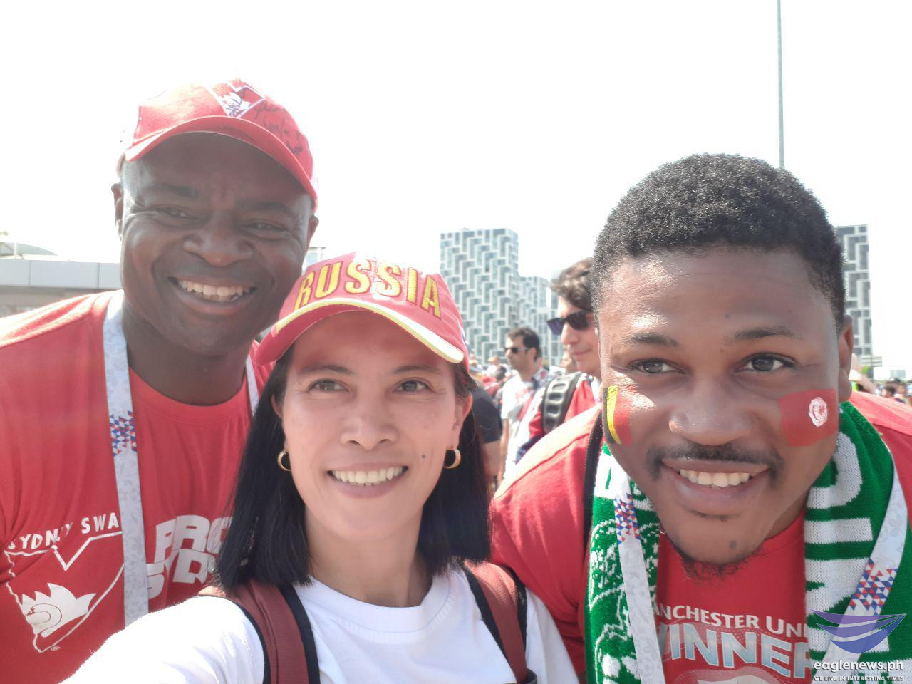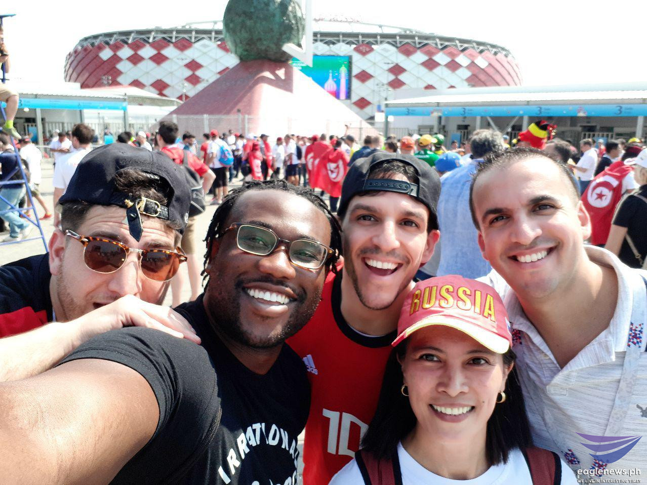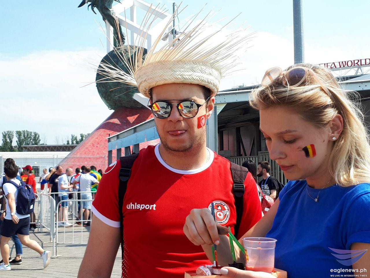 This Argentina team fan is all smiles as he holds his country’s flag with player Lionel Messi on it.These Tunisian fans appear to be saying the same thing: “Bring it on!”These fans look ready for a Belgium vs Tunisia match.EBC correspondent Emy Coloma takes a selfie with this fan from Belgium.These fans of the Brazil and Tunisia teams are obviously having a great time.These aficionados from Egypt are raring to go to “war.”The Mexico team fans are just as ready.EBC correspondent Emy Coloma poses with some of the fans.It’s Nigeria all the way!The Russian team can surely count on the all-out support of this couple!