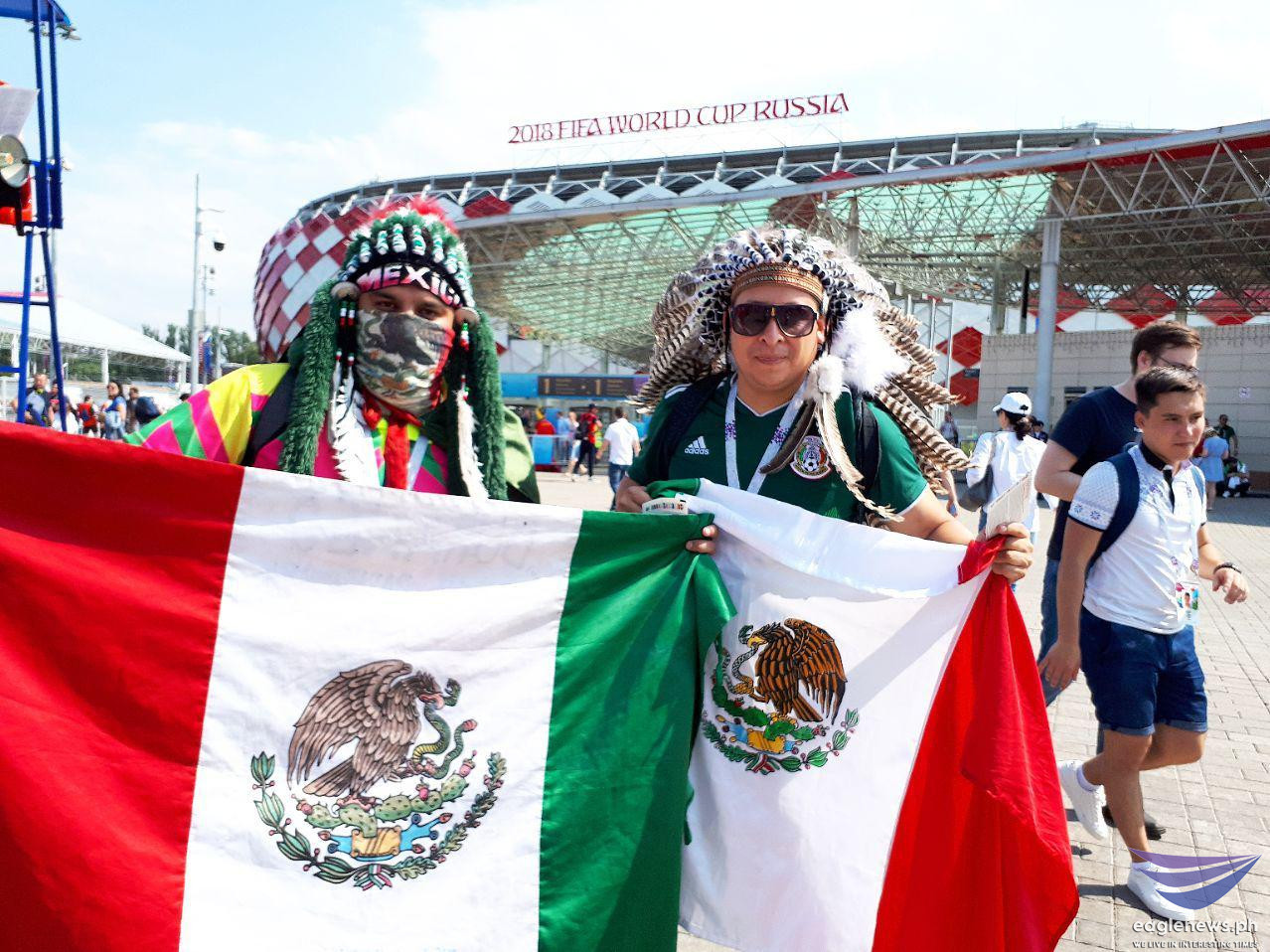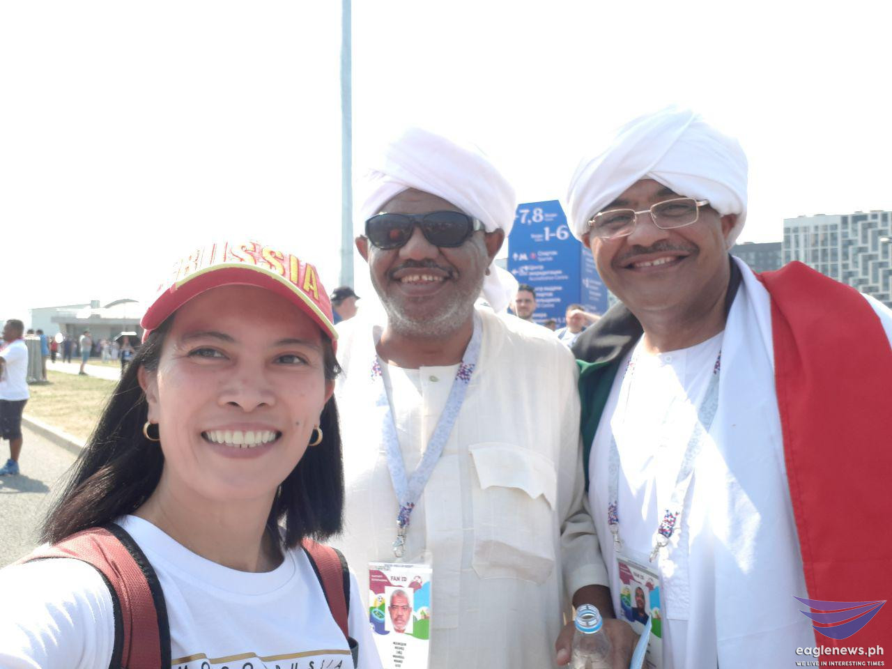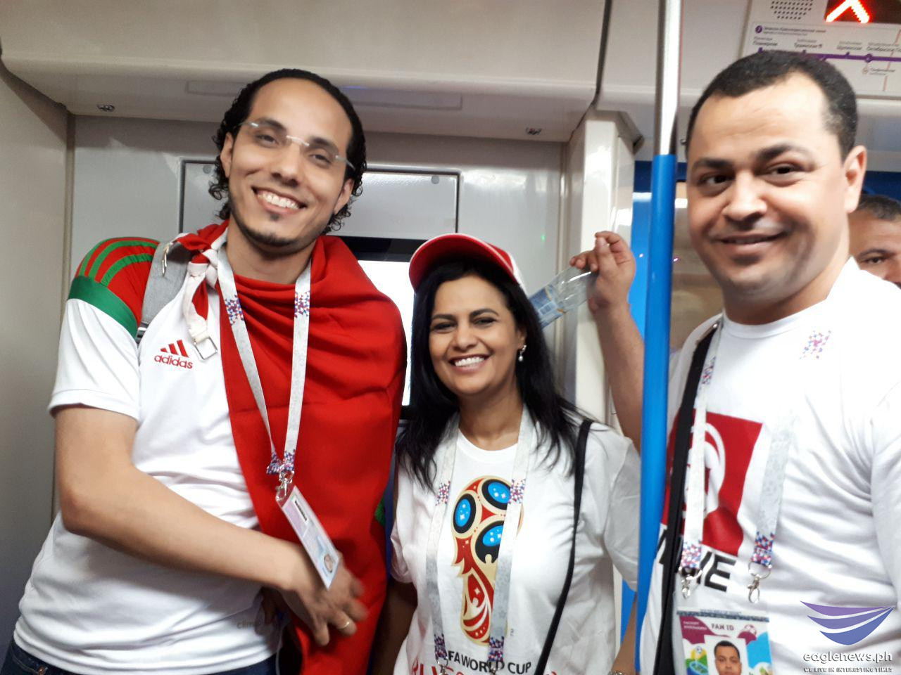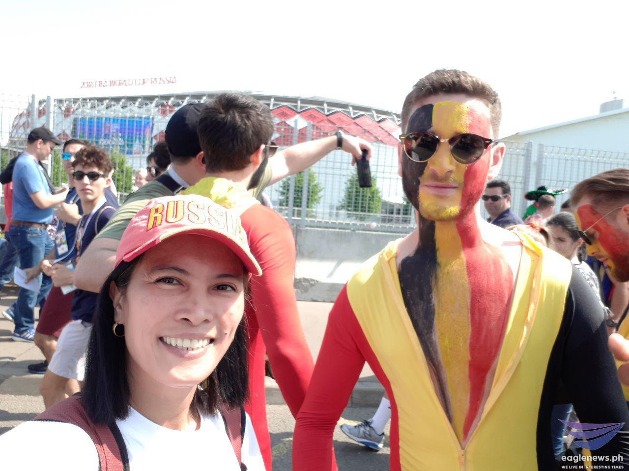 This Argentina team fan is all smiles as he holds his country’s flag with player Lionel Messi on it.These Tunisian fans appear to be saying the same thing: “Bring it on!”These fans look ready for a Belgium vs Tunisia match.EBC correspondent Emy Coloma takes a selfie with this fan from Belgium.These fans of the Brazil and Tunisia teams are obviously having a great time.These aficionados from Egypt are raring to go to “war.”The Mexico team fans are just as ready.EBC correspondent Emy Coloma poses with some of the fans.It’s Nigeria all the way!The Russian team can surely count on the all-out support of this couple!