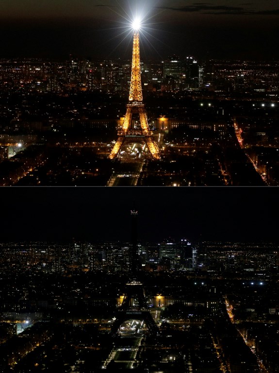 In these Agence France Presse photos, the Eiffel Tower and the Arc de Triomphe in Paris became one with the shadows as lights were dimmed for one hour to join the call to action to address climate change.