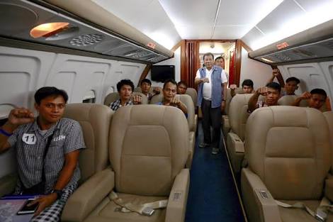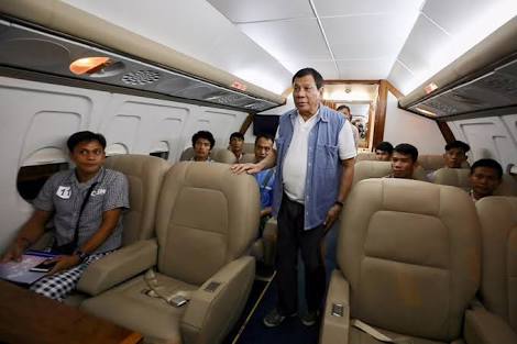 In these photos made available by the Presidential Communications Operations Office, President Rodrigo Duterte is seen on board the presidential plane with nine soldiers who were wounded in Marawi. The nine soldiers were taken by the President on a presidential flight from Cagayan de Oro to Manila, where they were to undergo medical treatment.
