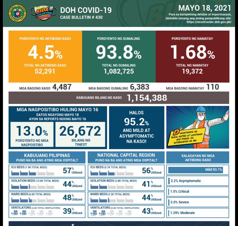 (Eagle News) – The number of new COVID-19 cases added on Tuesday, May 18, was recorded at 4,487, the lowest single-day tally so far this month.