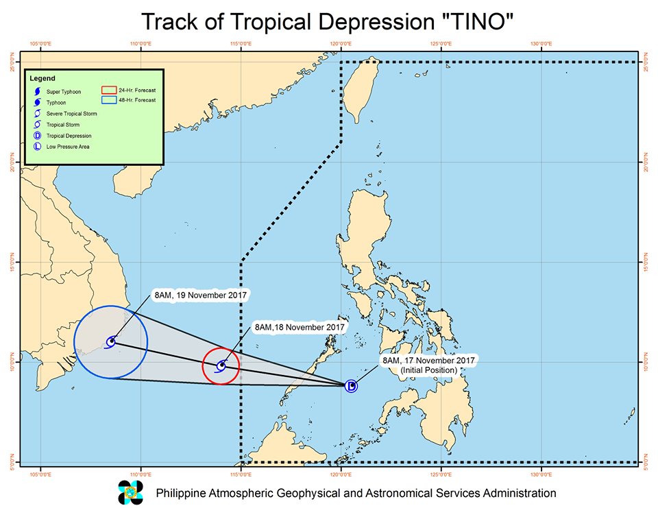 As of 10 a.m., PAGASA said the eye of TD Tino was located 245 km east southeast of Puerto Princesa.