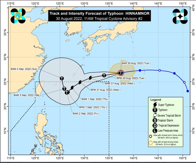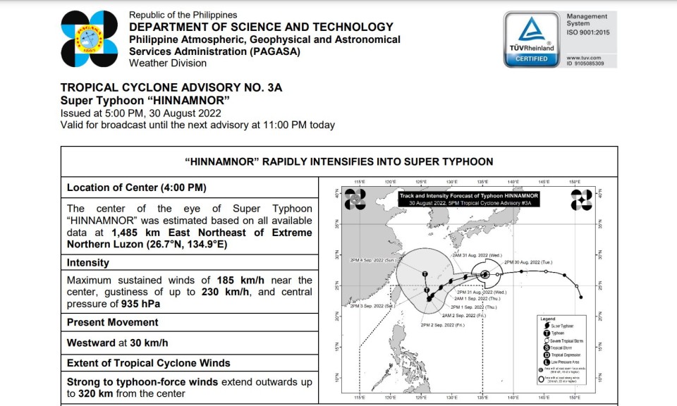 As of 4 p.m., the center of the eye of Super Typhoon “HINNAMNOR” was estimated based on all available data at 1,485 km East Northeast of Extreme Northern Luzon (26.7°N, 134.9°E), according to PAGASA’s tropical cyclone advisory no. 3A issued at 5 p.m. Tuesday, August 30.