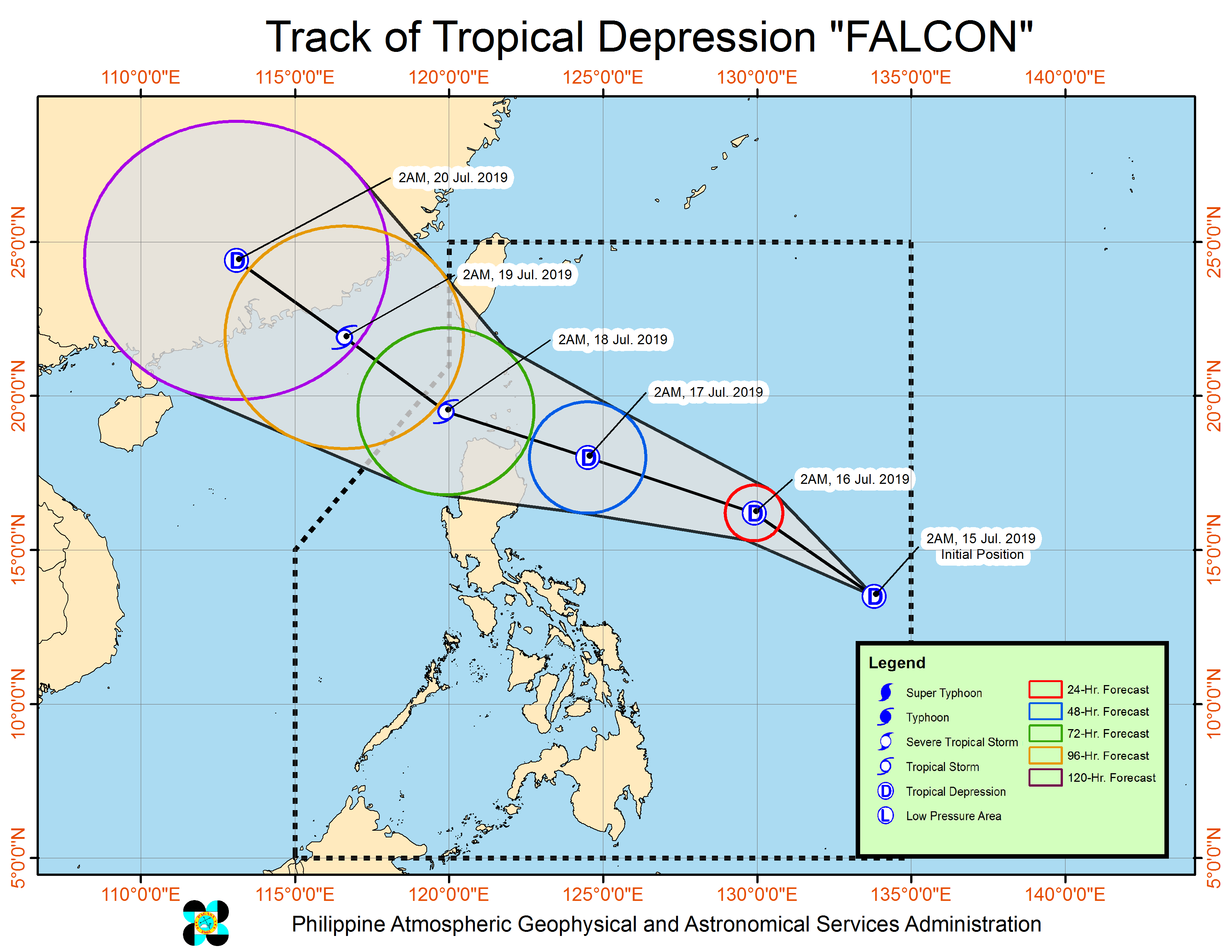 By Tuesday morning, July 16, tropical depression Falcon will be 830 km East of Casiguran, Aurora(16.2°N, 129.9°E), and on Wednesday morning, July 17, its location will be at 295 km East of Tuguegarao City, Cagayan(18.0°N, 124.5°E).