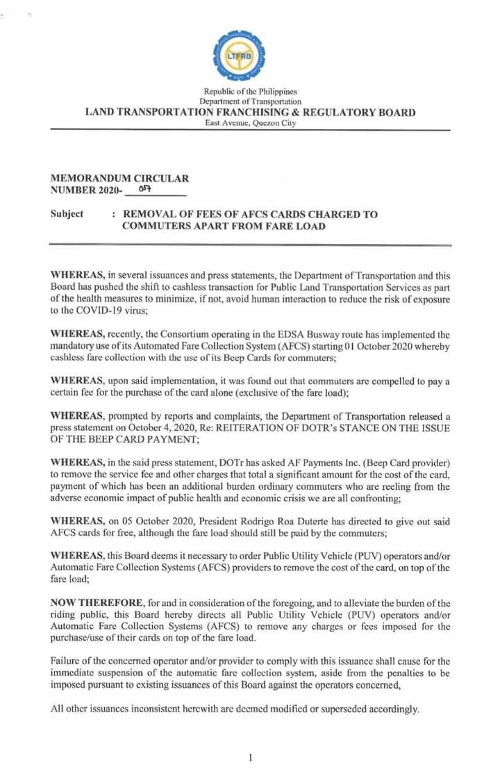 The LTFRB issued the directive in memorandum circular number 2020-057 after President Rodrigo Duterte said beep cards used in the Edsa bus system should be free.