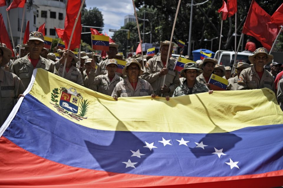 Pro-government protesters rally against US sanctions with a Venezuelan national flag in Caracas on August 7, 2019. – Washington warned China and Russia to avoid doing business with the Venezuelan regime of Nicolas Maduro, as delegates from some 60 countries discussed ways of ending the crisis in the South American nation. The admonition Tuesday came a day after President Donald Trump ordered a freeze on all Venezuelan government assets in the United States and barred transactions with its authorities. (Photo by Federico Parra / AFP)