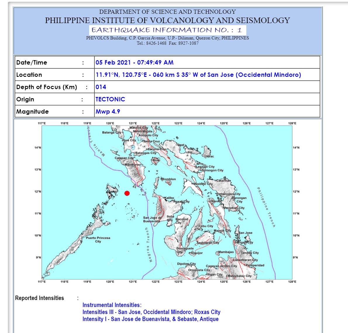 (Eagle News) — A magnitude 4.9 quake hit waters off Occidental Mindoro on Friday morning, Feb. 5, according to the Philippine Institute of Volcanology and Seismology. It was also felt at instrumental intensities in parts of Capiz and Antique.