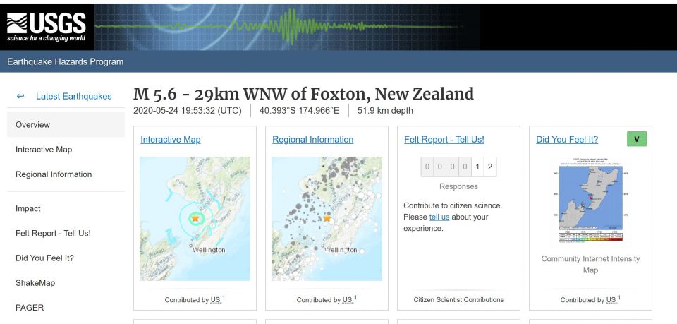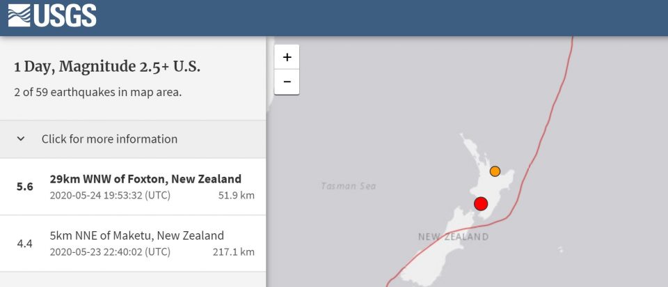 The USGS recorded it at 51.9 kilometers deep, and located it 29 kilometers west northwest of Foxton, located at the lower west coast of New Zealand’s North Island.