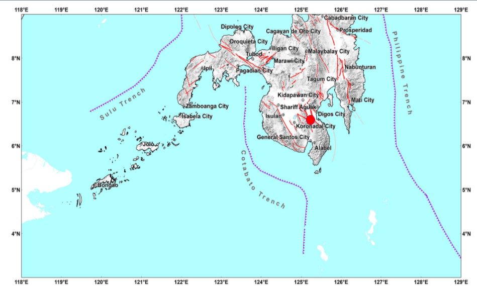 In its quake bulletin, Phivolcs said that the tectonic quake in Davao del Sur occurred at 1:44 a.m. on Monday. Its epicenter was located seven kilometers southeast of Kiblawan town, with a depth of 18 kilometers. It was also recorded at instrumental intensity 5 in Malungon, Sarangani, and at intensity 4 in Koronadal City and in Tupi, South Cotabato