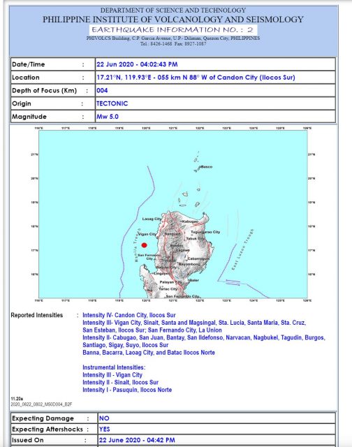 (Eagle News) – A magnitude 5 quake shook Ilocos Sur on Monday at around 4 p.m., according to the Philippine Institute of Volcanology and Seismology (PHIVOLCS).