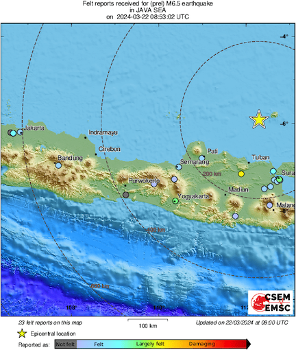 A magnitude-6.4 offshore earthquake hit near Indonesia’s Java island on Mar 22, 2024. (Photo: European Mediterranean Seismological Centre)