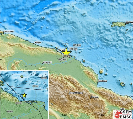 The quake hit about 20 kilometres (12 miles) off the coast, a short distance from the town of Wewak, capital of the Pacific island state’s East Sepik Province.