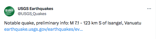 SYDNEY, Dec 7, 2023 (AFP) – A 7.1 magnitude earthquake struck south of Vanuatu on Thursday, the United States Geological Survey said, triggering a tsunami warning.