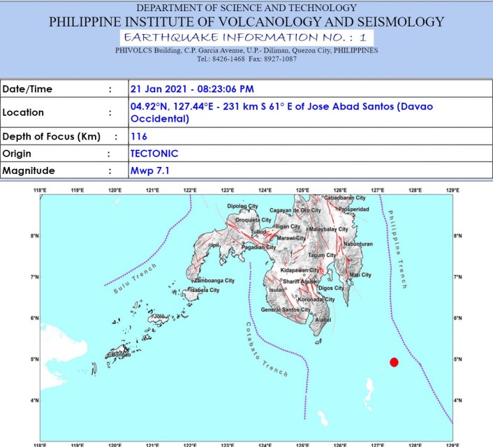 (Eagle News) – A magnitude 7.1 quake hit waters off Davao Occidental on Thursday night, Jan. 21, but was felt at lower intensities in surrounding areas because it occurred at a significant depth.