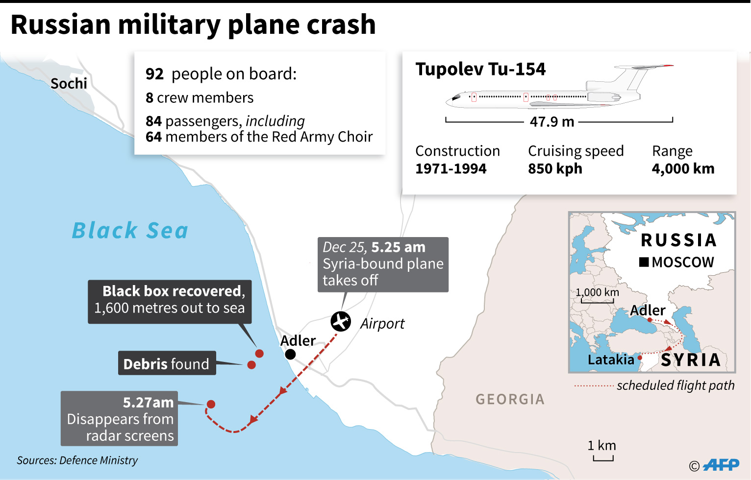 The Tu-154 jet, whose passengers included more than 60 members of the internationally renowned Red Army Choir, was heading to Russia’s military airbase in Syria on Sunday when it went down off the coast of Sochi shortly after take-off.