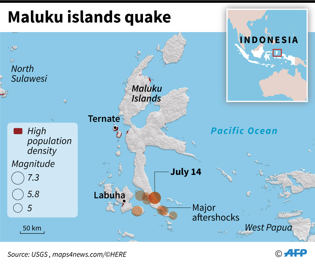 LABUHA, Indonesia (AFP) — A major 7.3-magnitude earthquake hit the remote Maluku islands in eastern Indonesia Sunday, sending panicked residents running into the streets, but no tsunami warning was issued.