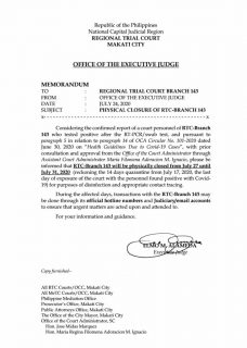Branch 143 of the Makati RTC will be closed starting Monday, July 27, after an employee tested positive for COVID-19. This is based on a memo from Executive Judge of the Makati RTC Elmo Alameda uploaded on the SC Twitter account./SC/