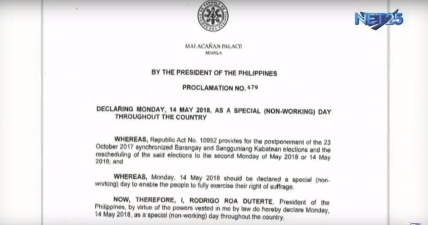 (Eagle News) – Malacanang has declared May 14, the day of the barangay and Sangguniang Kabataan Elections, as a special non-working holiday.