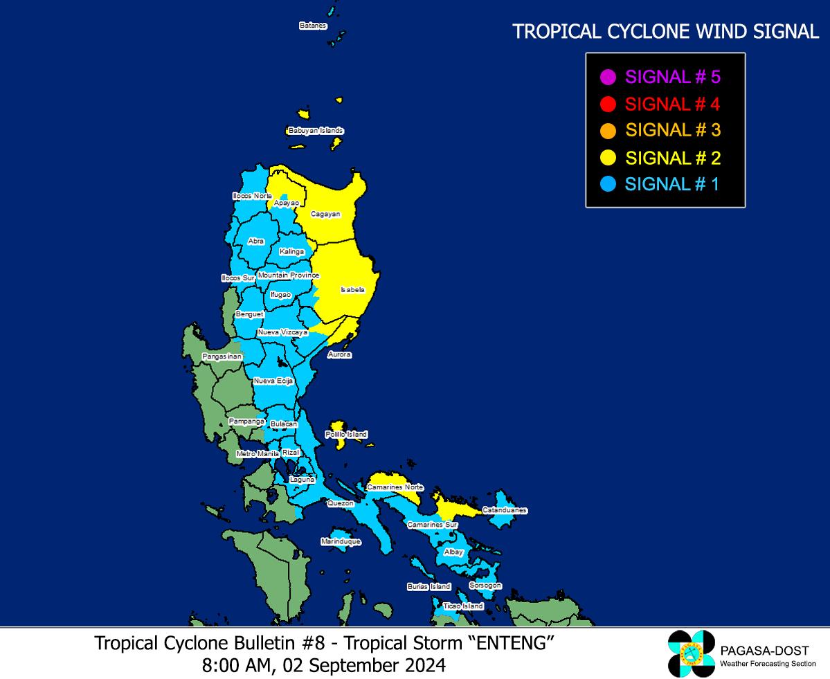 Several areas in Luzon are now under tropical cyclone wind signal (TCWS) No. 2 as Tropical Storm Enteng (international name Yagi) slightly intensified, the weather bureau said Monday. Enteng packs maximum sustained winds of 75 kilometers per hour near the center and gustiness of up to 90 kph. It was last tracked over the coastal waters of Camarines Norte.