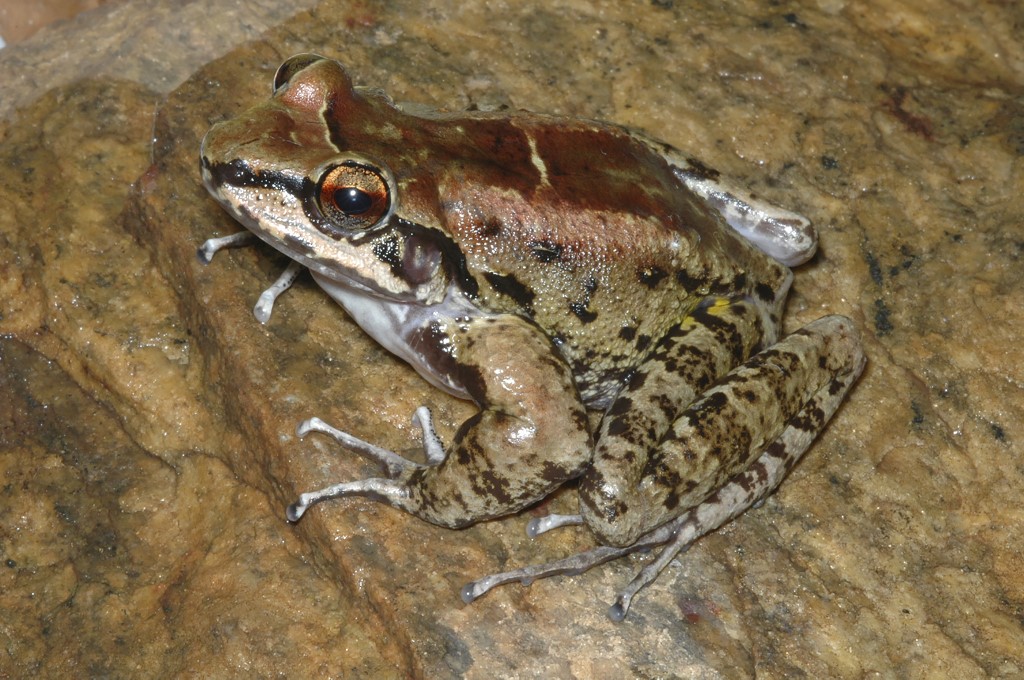 These frogs favor rocks and have a reddish-brown coloration that helps them blend in with their surroundings.