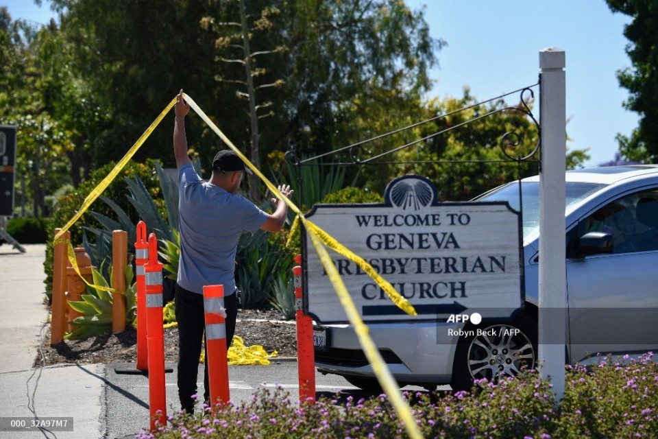 A church staff member raises police tape for a car to exit at the Geneva Presbyterian Church May 16, 2022 after one person was killed and five injured during a shooting May 15, 2022 at the church in Laguna Woods, California. – A Chinese immigrant who padlocked a church and opened fire on its Taiwanese-American congregation, killing one person and injuring five others, was motivated by hatred of the island and its people, US investigators said May 16. (Photo by Robyn Beck / AFP)