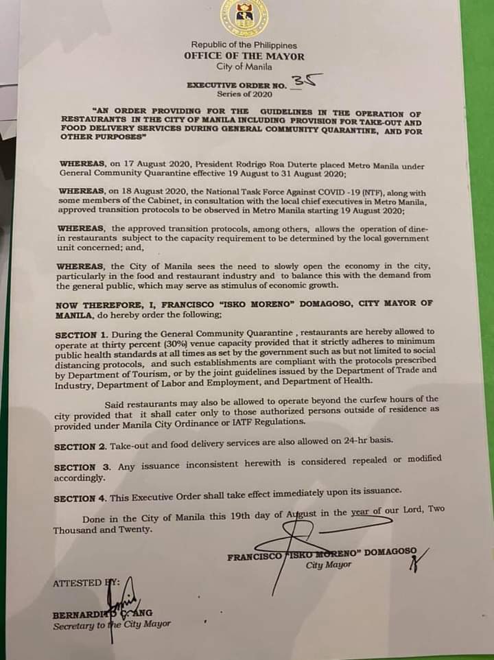 This is provided they shall cater only to authorized persons outside residences, based on Manila city ordinances and Inter-Agency Task Force for the Management of Emerging Infectious Diseases, Executive Order No. 35 signed by Mayor Isko Moreno on Aug. 19 said.