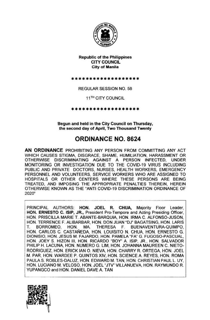 Under Ordinance No. 8624, or it shall be unlawful for any person to commit any act of or make utterances which may cause stigma, disgrace, shame, humiliation, harassment or otherwise discriminating against a person infected with COVID-19, or those under investigation or monitoring for the disease.