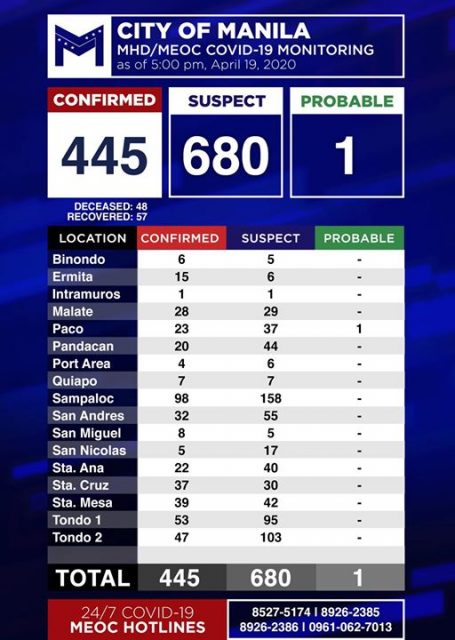 The announcement came as the Manila Health Department (MHD) reported 13 new cases of COVID-19 in the city, bringing the total to 445.
