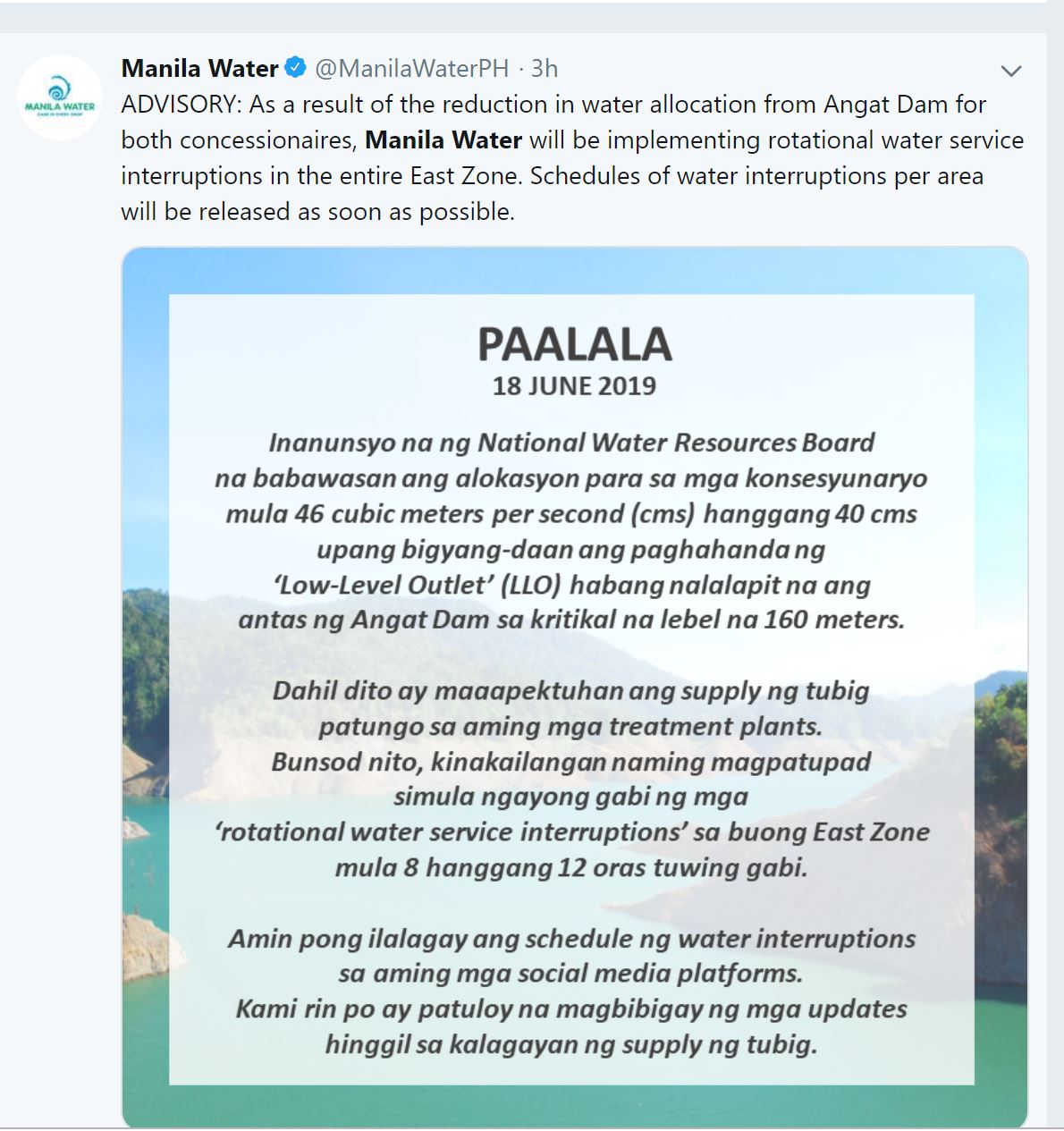 (Eagle News) – Manila Water started its rotational service interruption Tuesday night in its East Zone concession area as the water in Angat Dam in Bulacan nears its critical level.