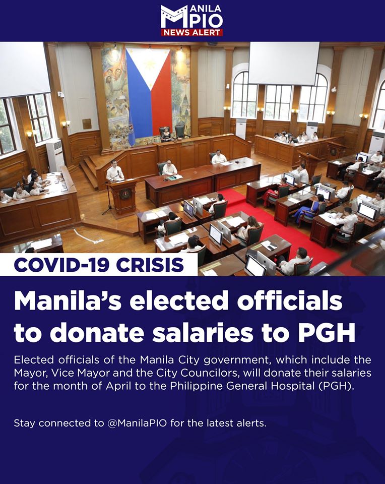 (Eagle News) – Manila’s top officials will donate their entire salaries for the month of April to the Philippine General Hospital (PGH), one of the country’s COVID-19 referral hospitals.