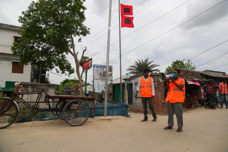 A Cyclone Preparedness Programme (CPP) volunteer uses a megaphone to urge residents to evacuate to shelters ahead of the expected landfall of cyclone Amphan in Khulna on May 19, 2020. – India and Bangladesh began evacuating more than two million people May 18 as a cyclone barrelled towards their coasts, with officials racing to ready extra shelters amid fears of coronavirus contagion in cramped refuges. (Photo by Kazi Shanto / AFP)