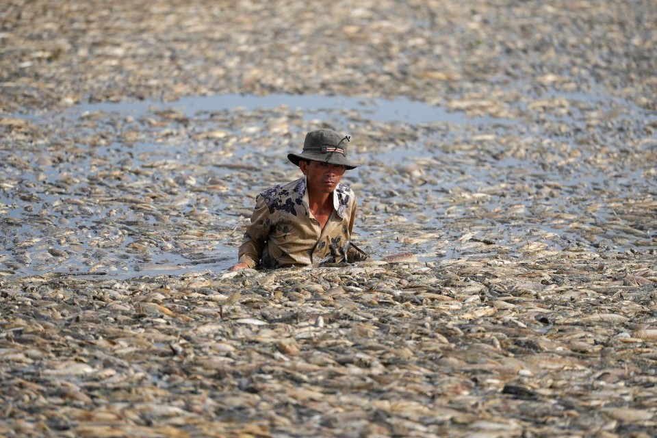 Pictures show residents wading and boating through the 300-hectare Song May reservoir, with the water barely visible under a blanket of dead marine life.