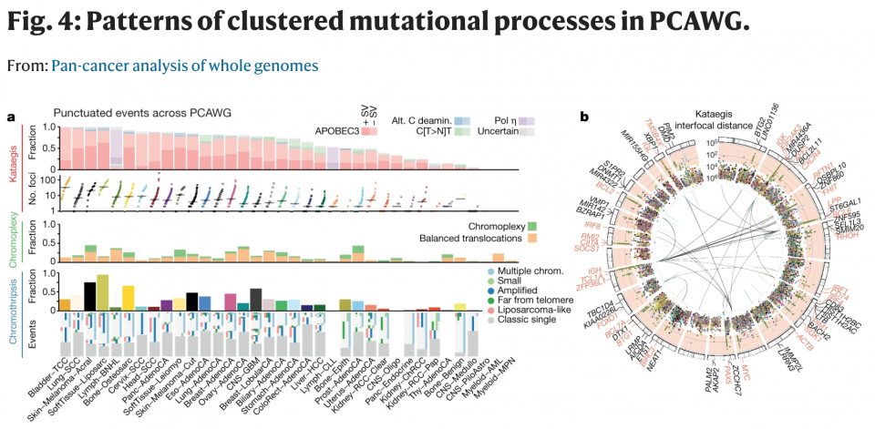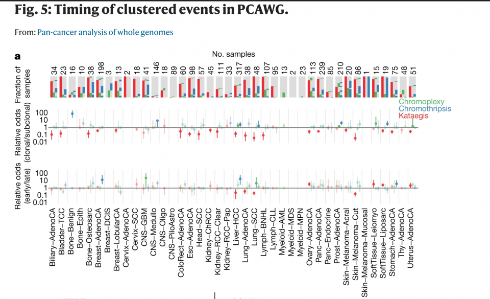 Screenshot of stacked bar charts illustrate co-occurrence of chromothripsis, kataegis and chromoplexy in the samples.