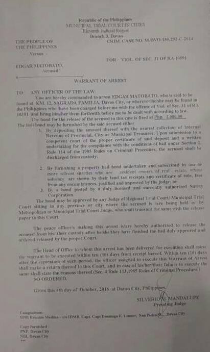 Matatandaan na nag-ugat ang paglabas ng warrant of arrest ng Municipal Trial Court in Cities (MTCC) Branch 3 laban kay Matobato matapos nitong hindi sumipot sa itinakdang arraignment ng korte noong Martes ng umaga, October 3, 2016 sa Davao.