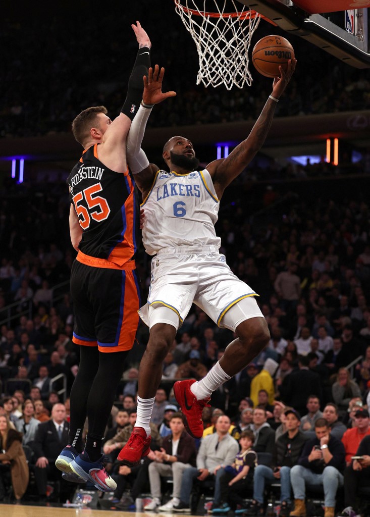 LeBron James #6 of the Los Angeles Lakers heads for the net as Isaiah Hartenstein #55 of the New York Knicks defends in the final minutes of the game at Madison Square Garden on January 31, 2023 in New York City. (Photo by ELSA / GETTY IMAGES NORTH AMERICA / Getty Images via AFP)