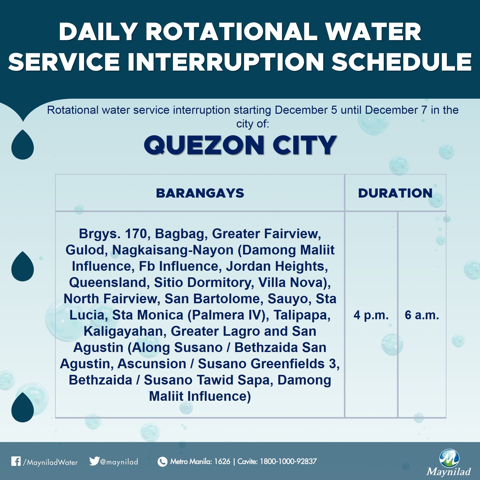 (Eagle News) — Maynilad customers in Caloocan, Quezon City, Valenzuela and parts of Bulacan will experience water service interruption from Saturday, December 5, to Monday, December 7.