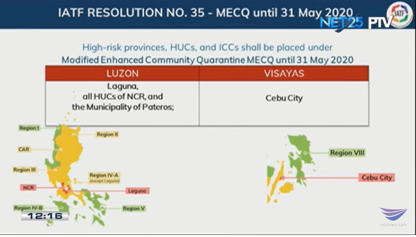 (Eagle News) — Metro Manila, Laguna and Cebu City shall be placed under a so-called “Modified Enhanced Community Quarantine starting May 16 where strict lockdown measures will be implemented but there would be some essential industries to be allowed with 50 percent workforce, Presidential Spokesperson Harry Roque announced on Tuesday, May 12.