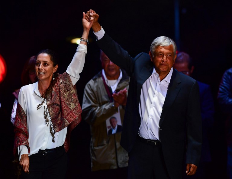 Mexico’s presidential candidate Andres Manuel Lopez Obrador (R), standing for the coalition “Juntos haremos historia”, and candidate for Governor of Mexico City Claudia Sheinbaum, hold hands during the closing campaign rally at the Azteca stadium in Mexico City, on June 27, 2018, ahead of the upcoming July 1 presidential election. / AFP Photo / Ronaldo Schemidt