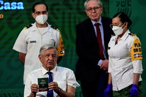 Mexican President Andres Manuel Lopez Obrador (L, bottom) shows his vaccination card after being inoculated with the first dose of the Astra Zeneca vaccine against COVID-19 after his daily morning press conference at the National Palace, next to his Health Minister Jorge Alcocer (R, top) in Mexico City on April 20, 2021. (Photo by PEDRO PARDO / AFP)