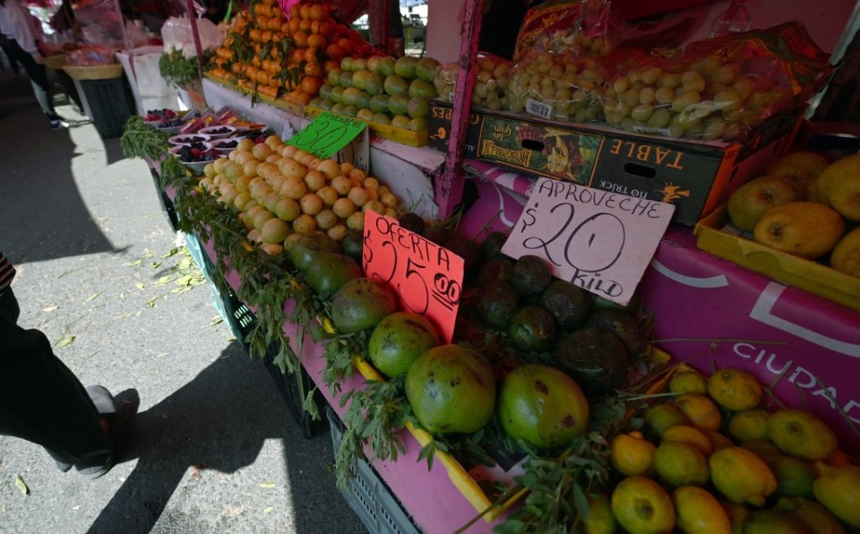 View of fuits and signs with their prices at a market in Mexico City on November 10, 2021. – The rebound of the Mexican economy following the COVID-19 pandemic is insufficient to alleviate the slowdown of activities and to contain inflation. (Photo by ALFREDO ESTRELLA / AFP)