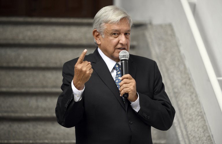 (FILES) In this file photo taken on July 31, 2018 Mexico’s President-elect Andres Manuel Lopez Obrador speaks during a press conference at his party’s headquarters in Mexico City. / AFP Photo / Alfredo Estrella