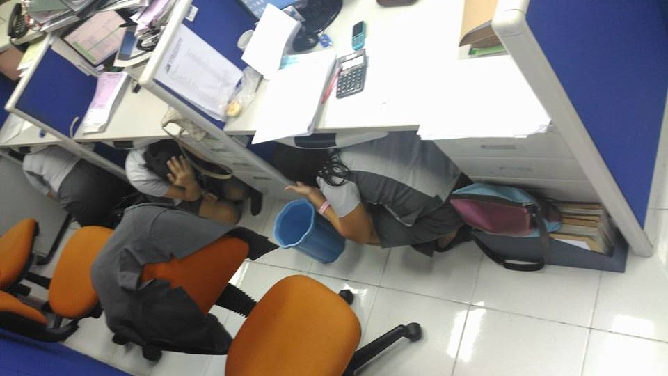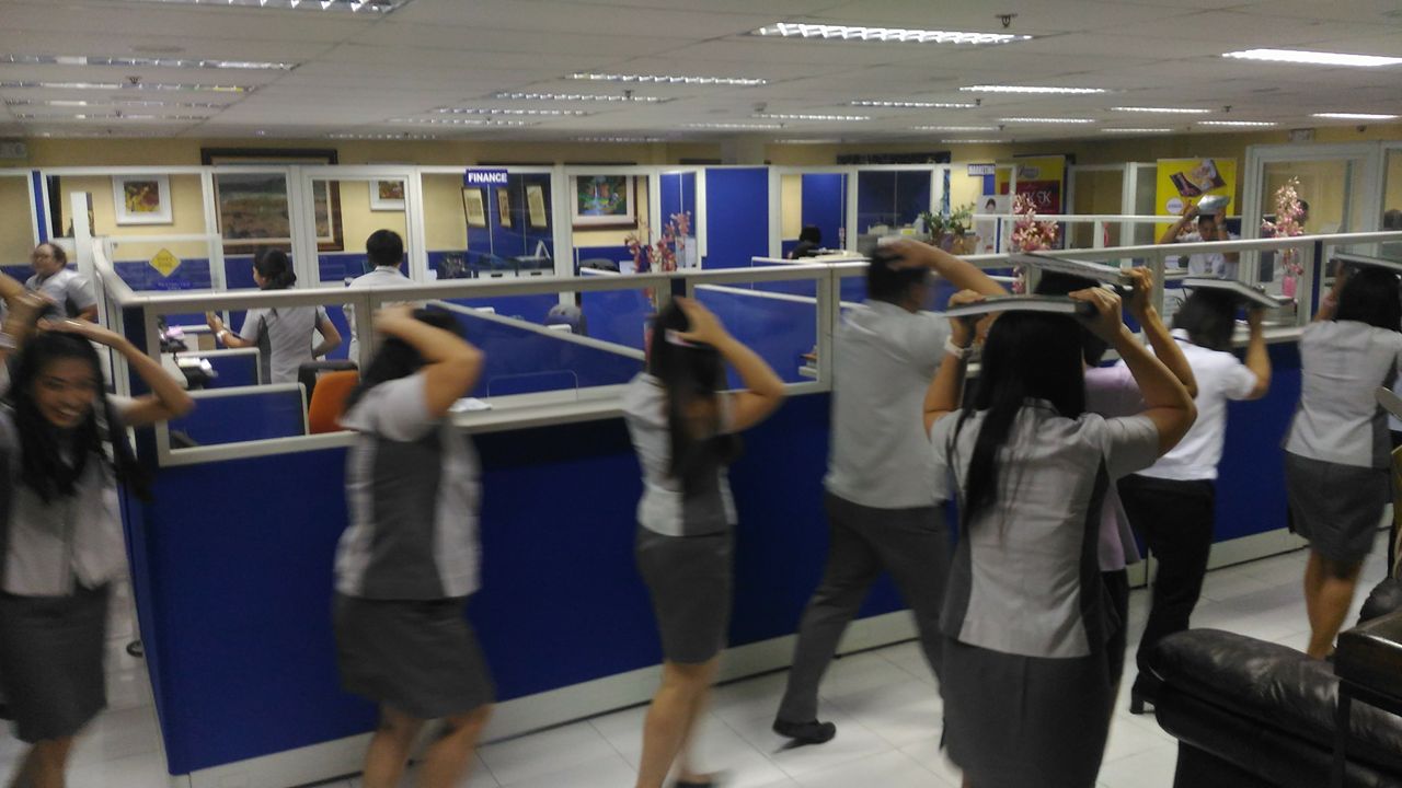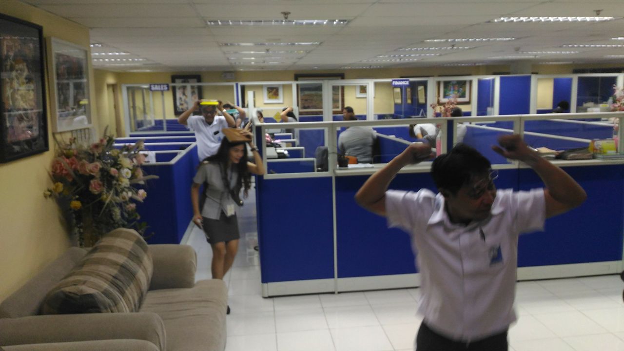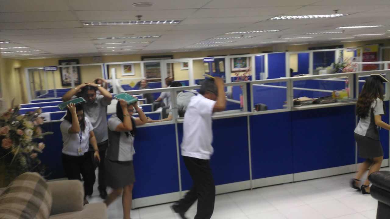 Duck, cover at hold on ang unang ginawa ng mga empleyado upang protektahan ang kanilang mga sarili sa maaaring tumama sa kanila.
