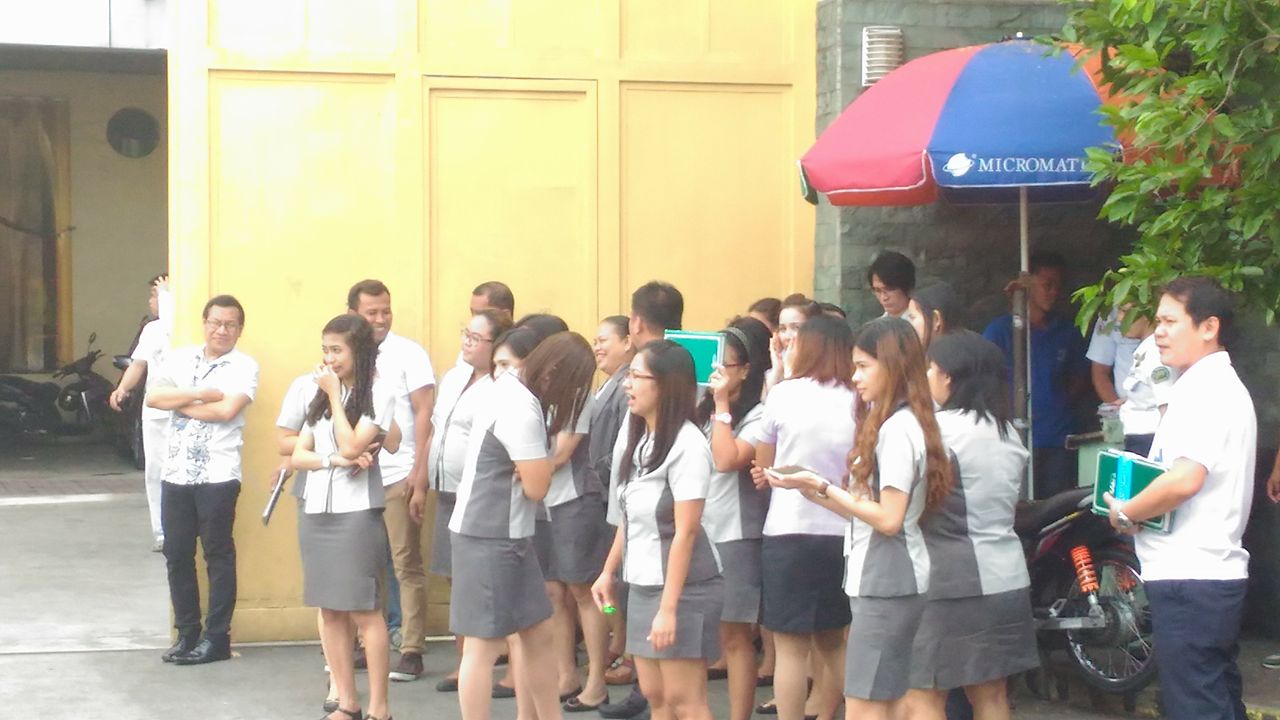 At pagkalabas sa opisina ay nag-ipon-ipon sila sa isang lugar na malayo sa mga poste ng kuryente at matataas na building na maaaring mabagsakan sila. Correspondent: Eric Nival-Holy Spirit, Q.C.