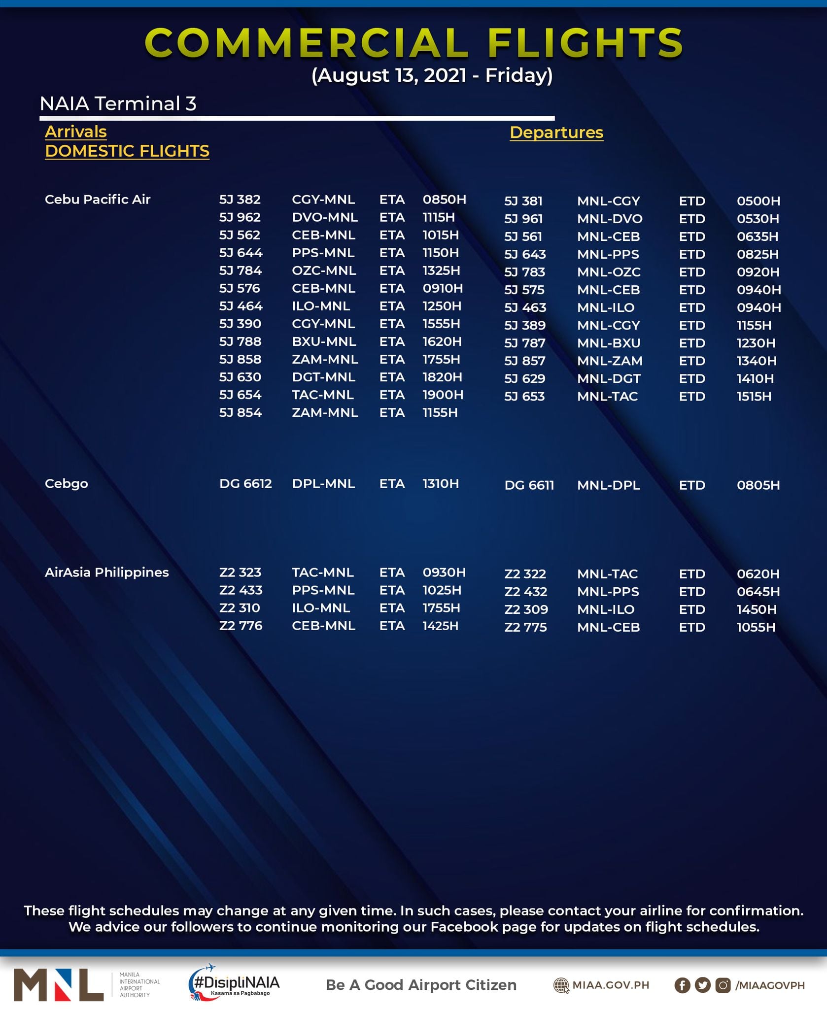 (Eagle News) — The Manila International Airport Authority has released its list of operational commercial flights for Friday, Aug. 13: