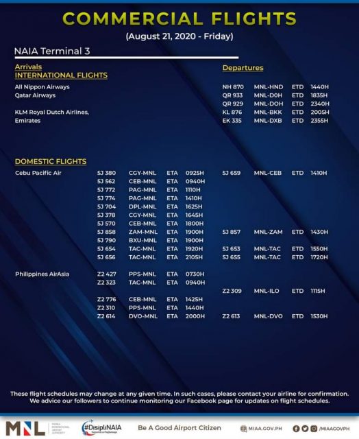 (Eagle News)–The Manila International Airport Authority has released its list of operational commercial flights for Friday, Aug. 21: