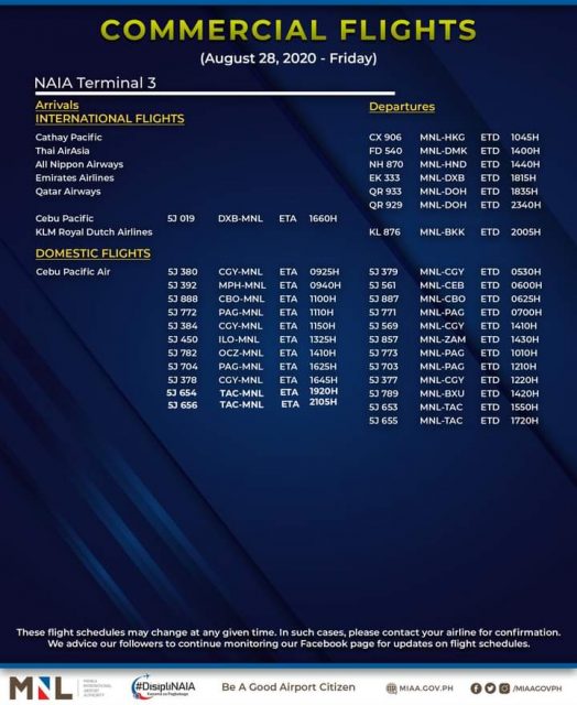 (Eagle News)–Manila International Airport Authority has released its list of operational commercial flights for Friday, Aug. 28: