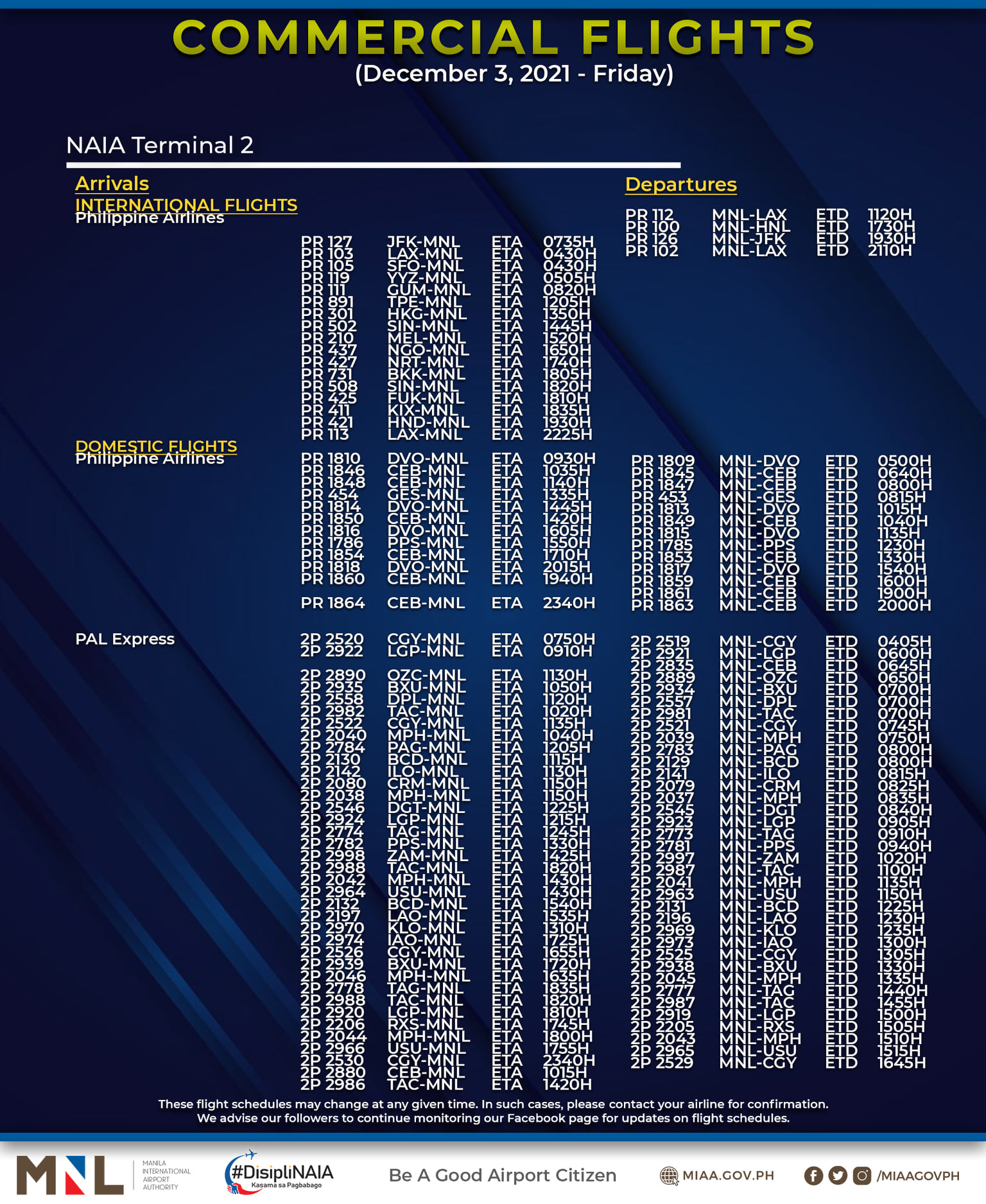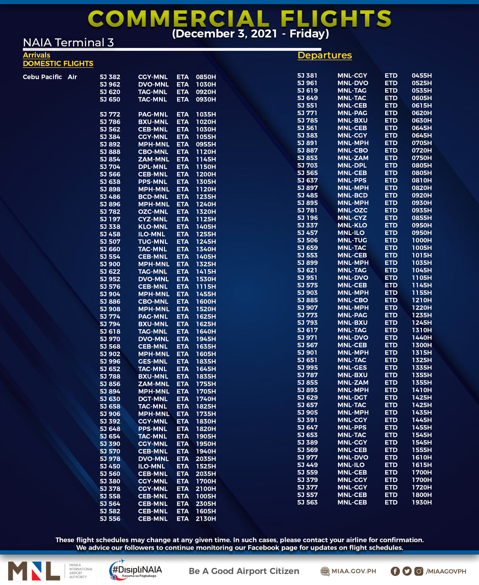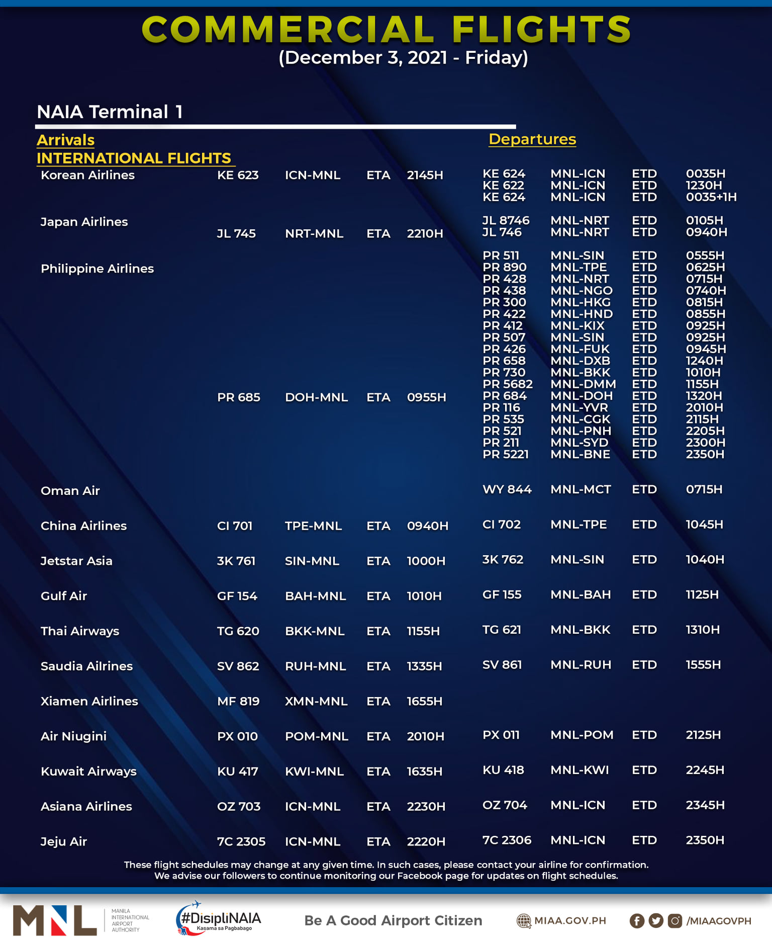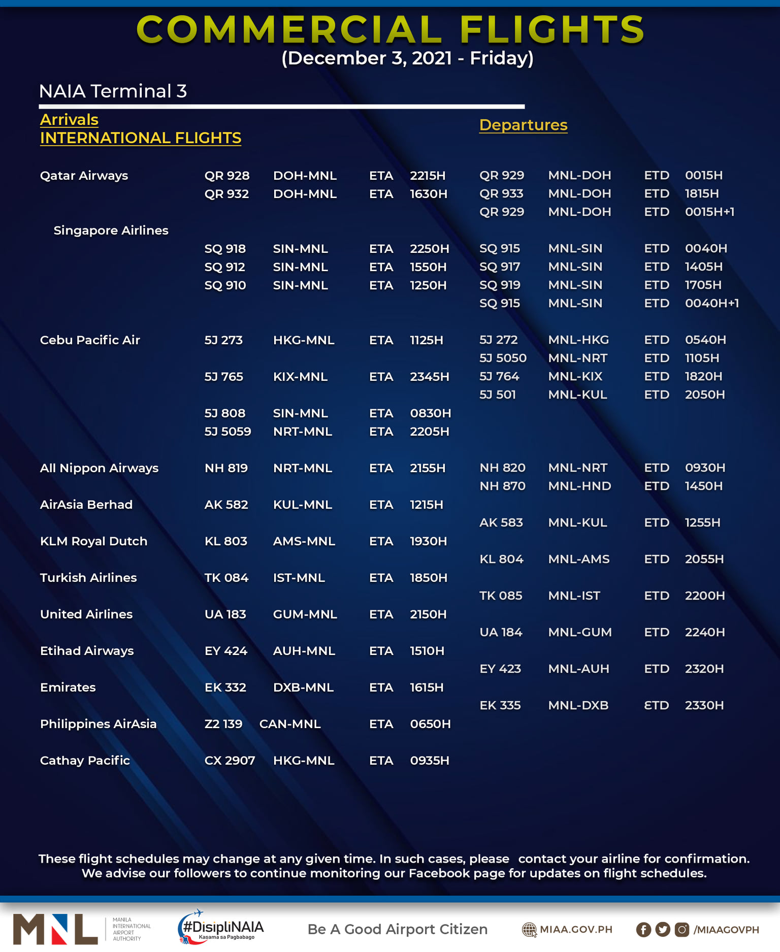 (Eagle News) — The Manila International Airport Authority has released its list of operational commercial flights for Friday, Dec. 3: