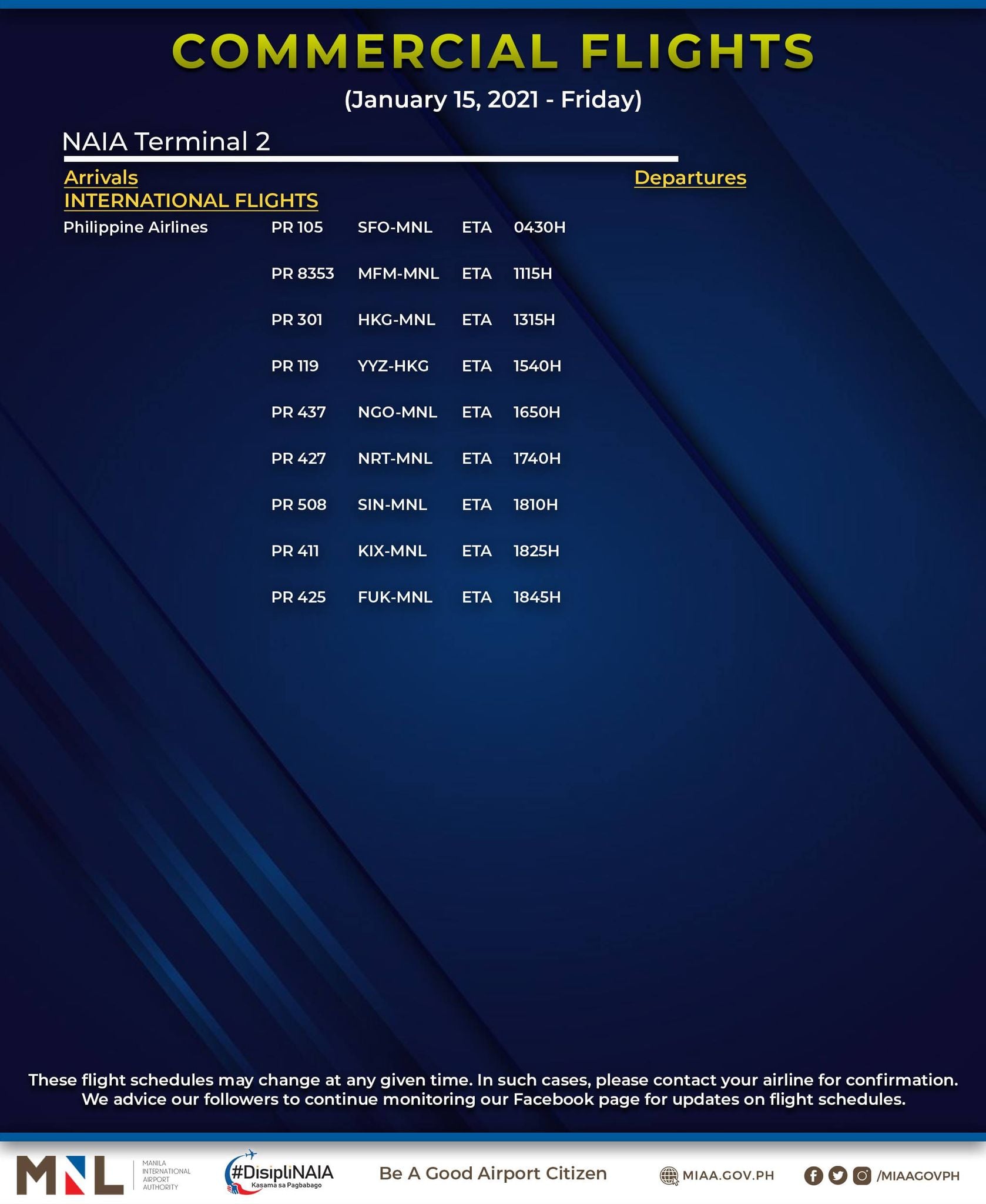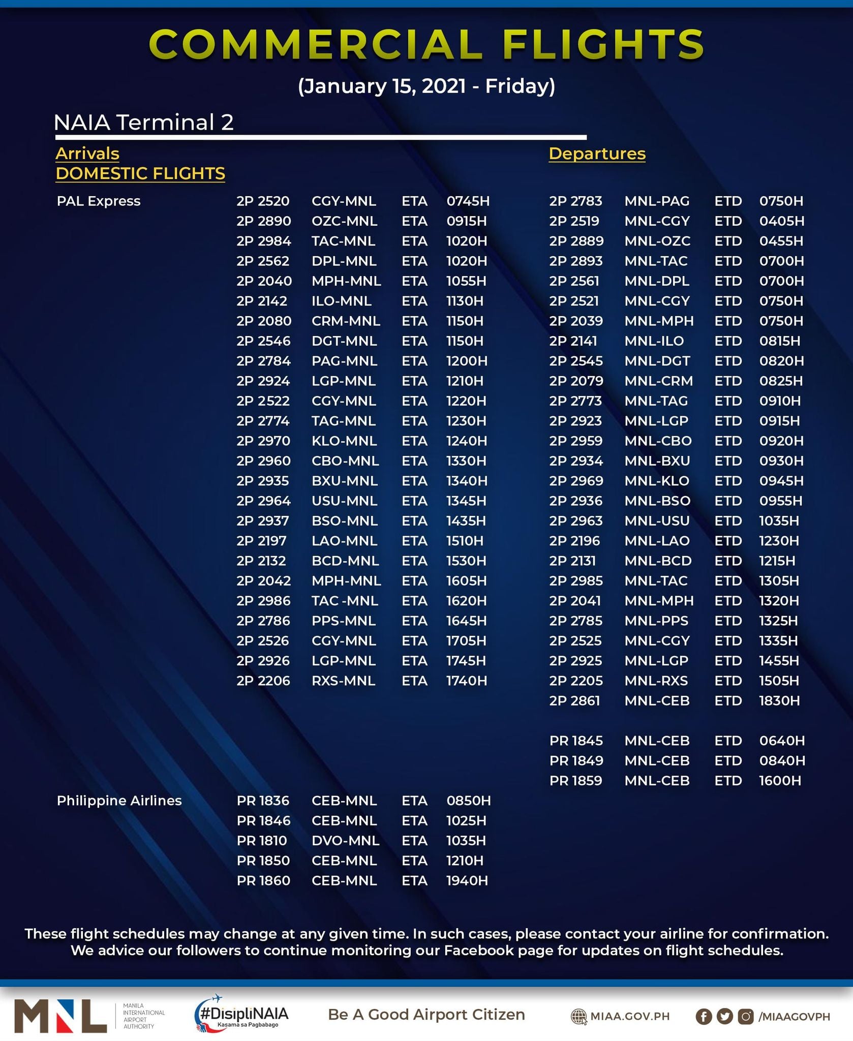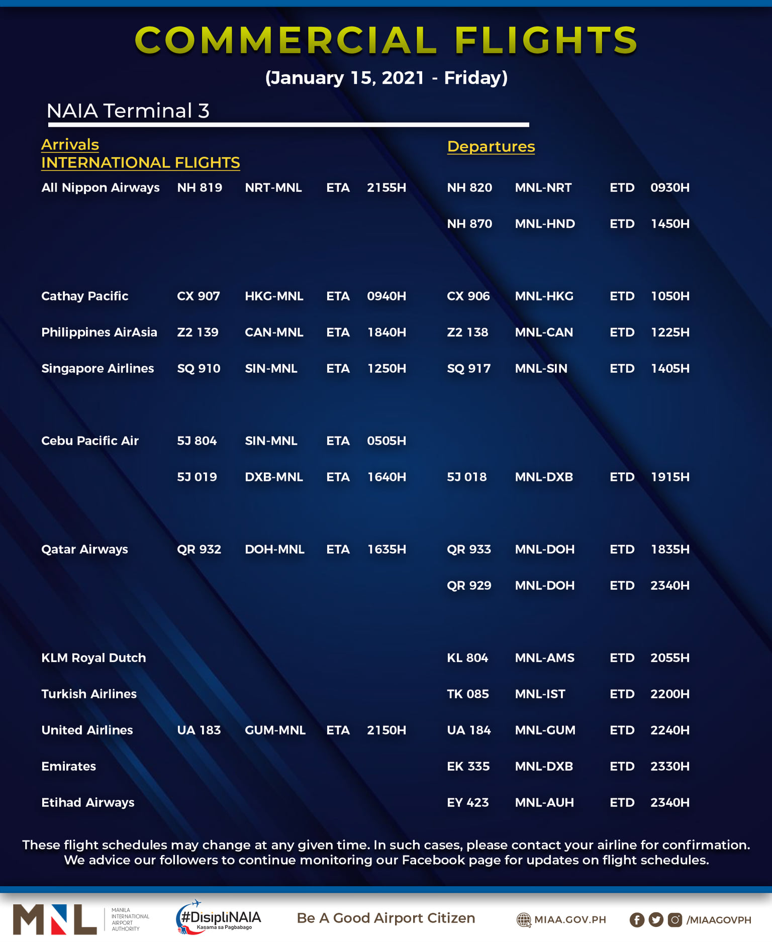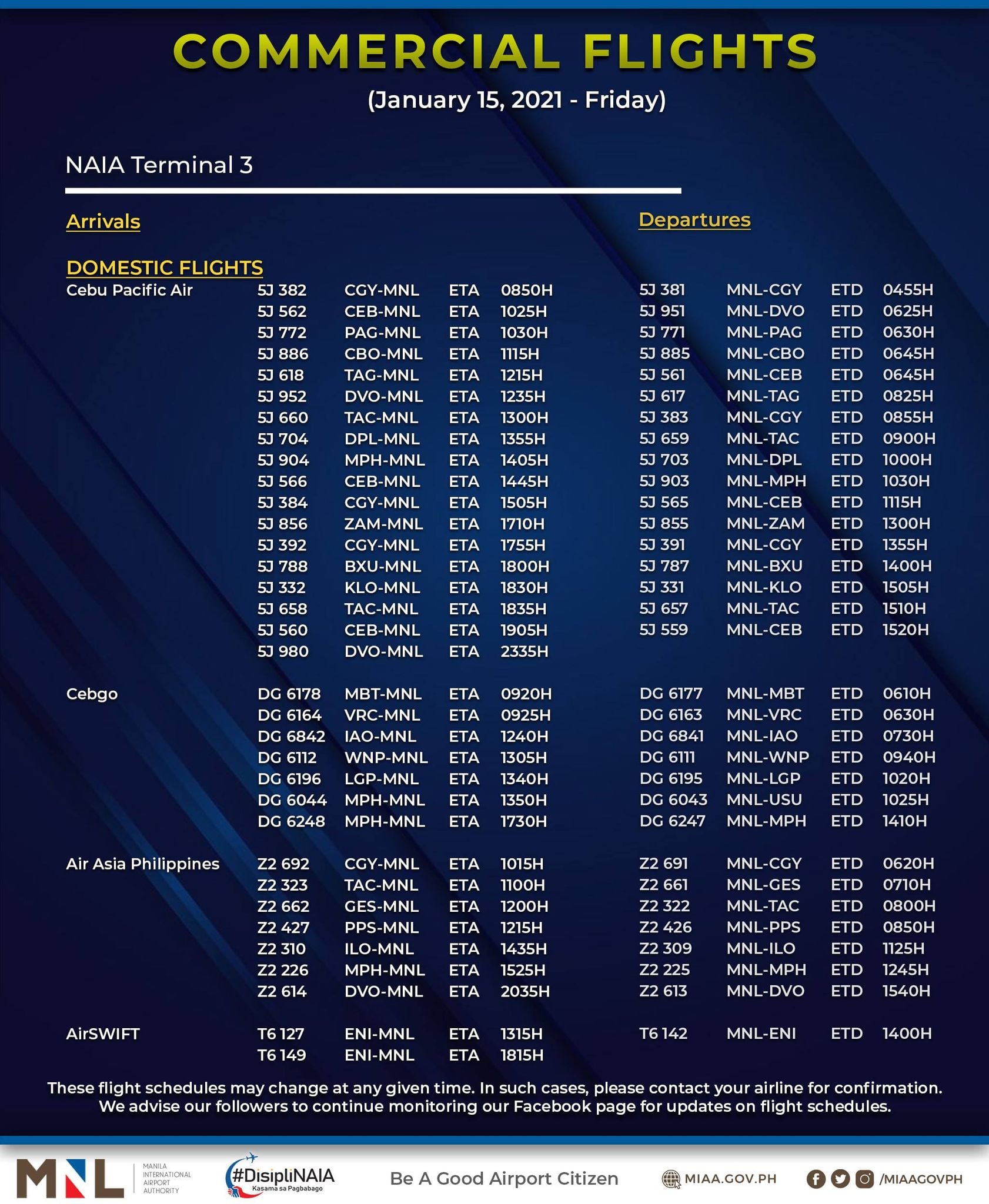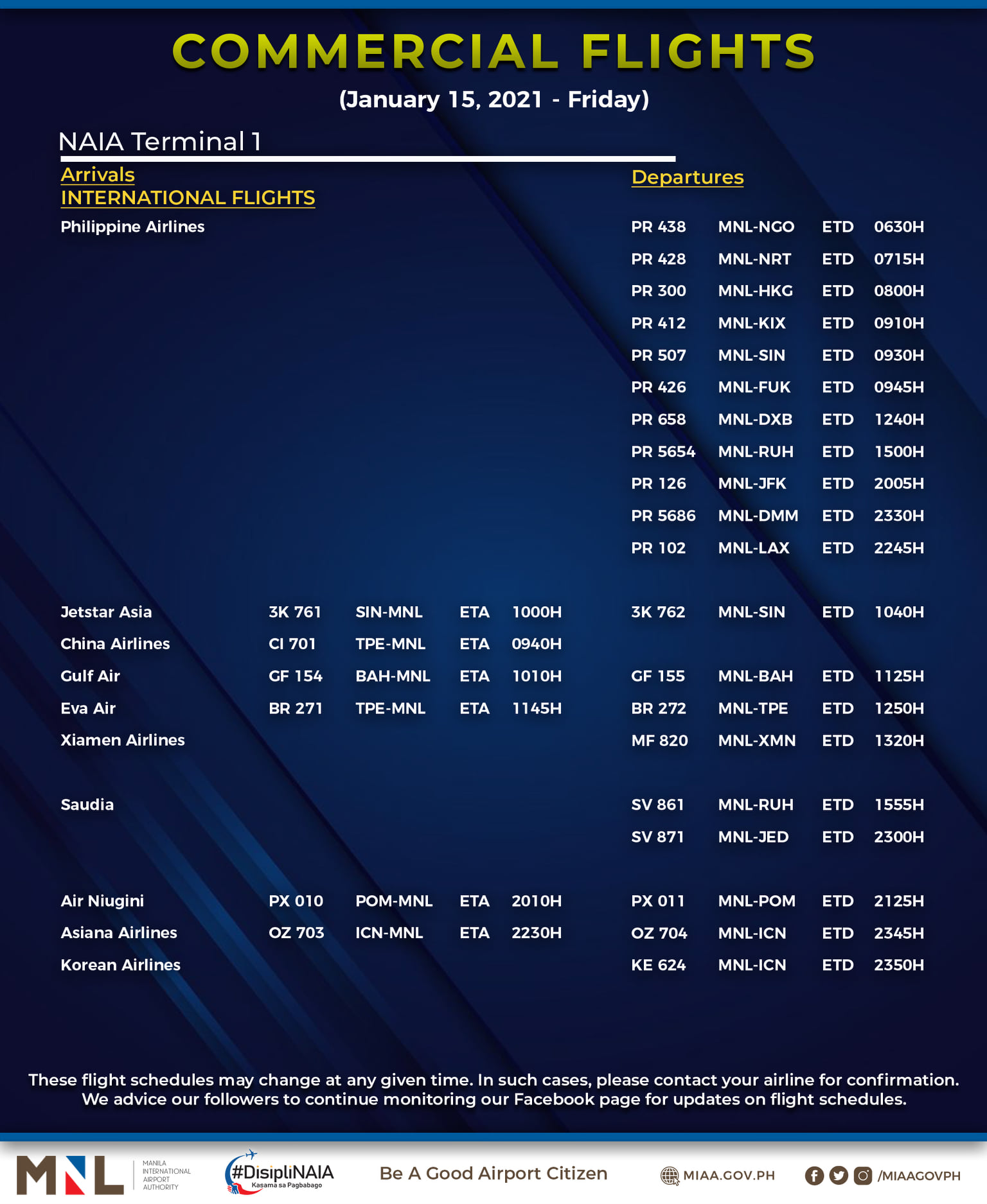 (Eagle News) — The Manila International Airport Authority has released its list of operational commercial flights for Friday, January 15: