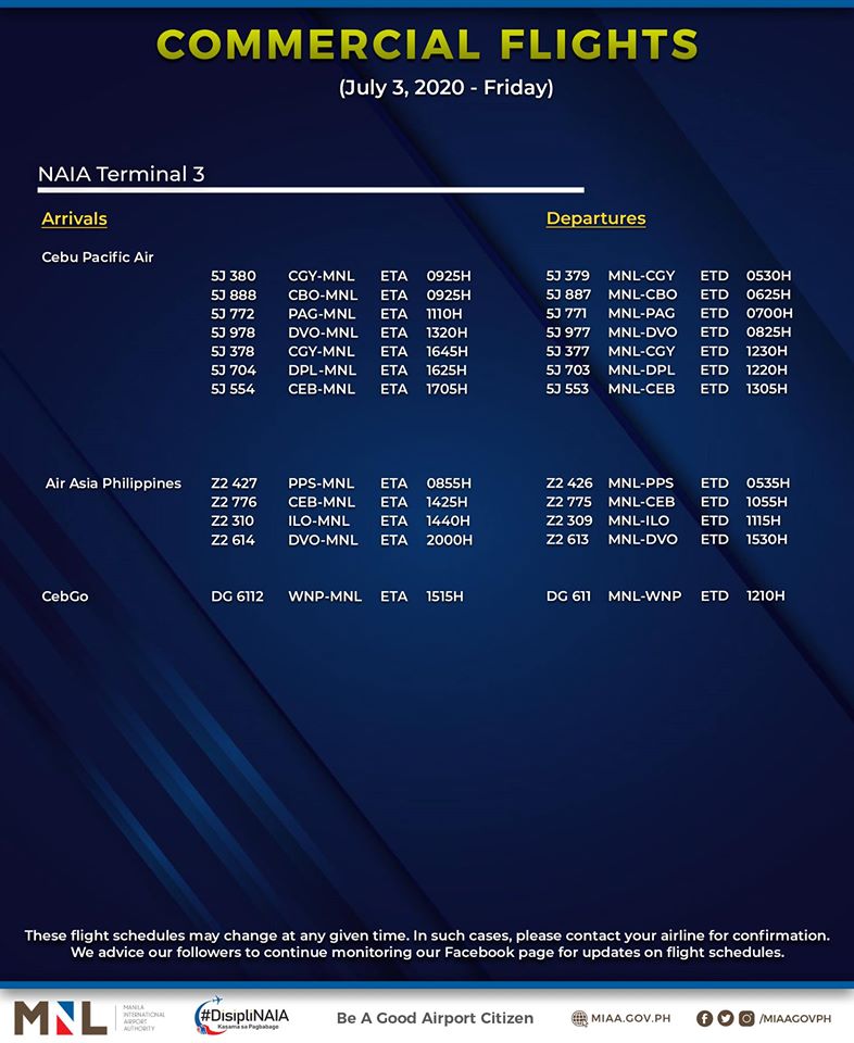 (Eagle News) — The Manila International Airport Authority has released its list of operational commercial flights for Friday, July 3: